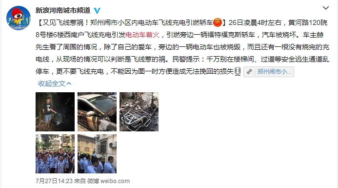 7.27日,郑州某小区飞线充电引燃轿车;夜间下雨,某小区电动车仍在露天充电,引起火花。